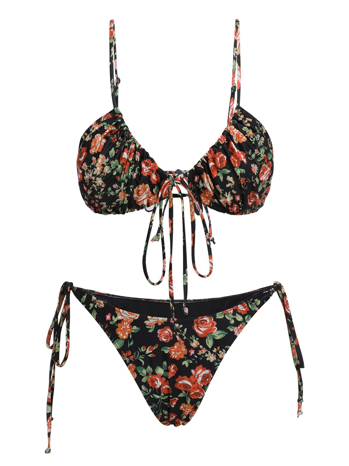 1950s Floral Lace-Up Spaghetti Strap Bikini Set