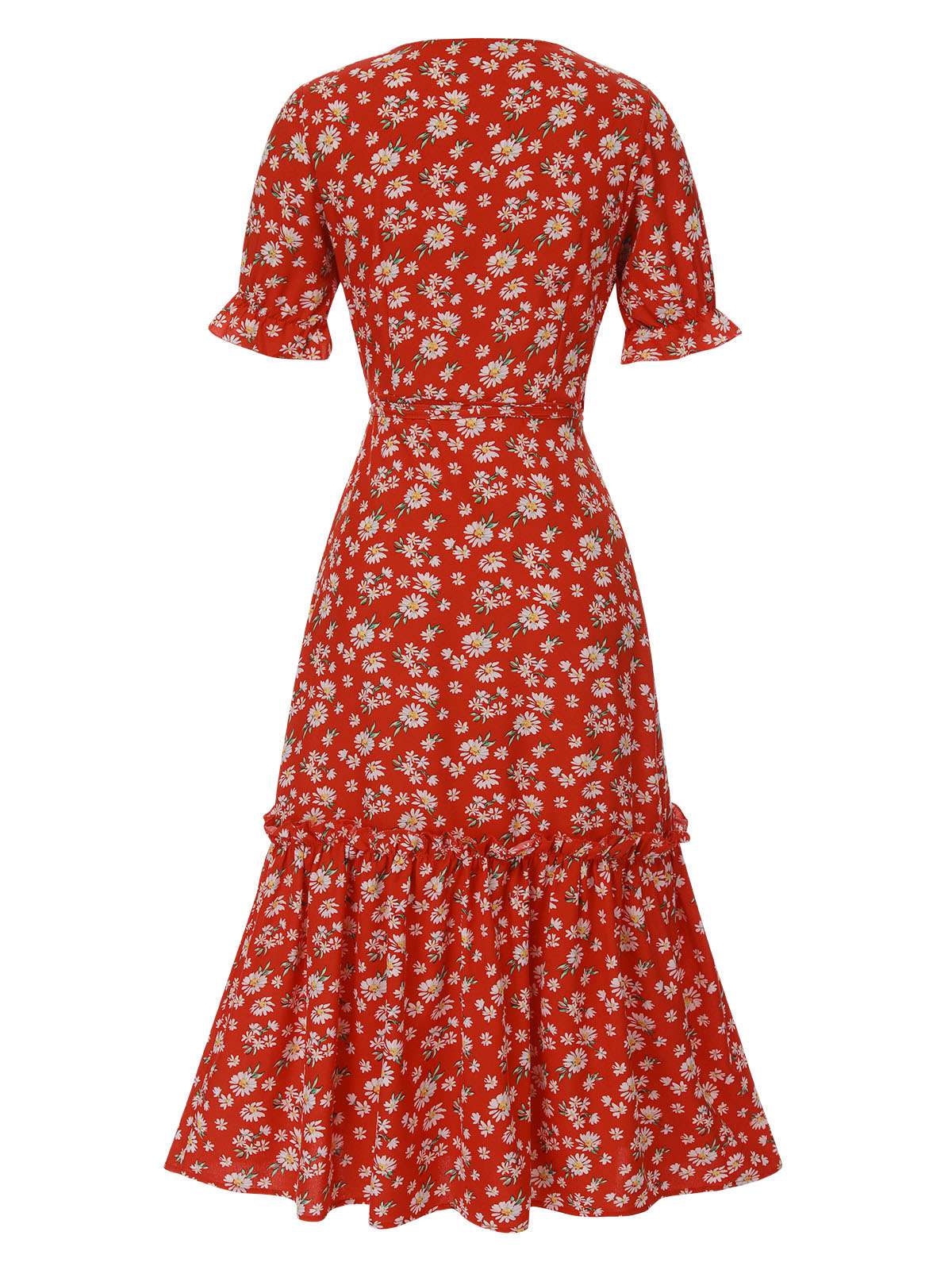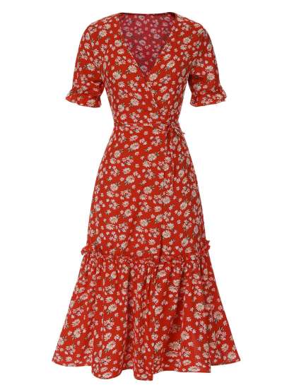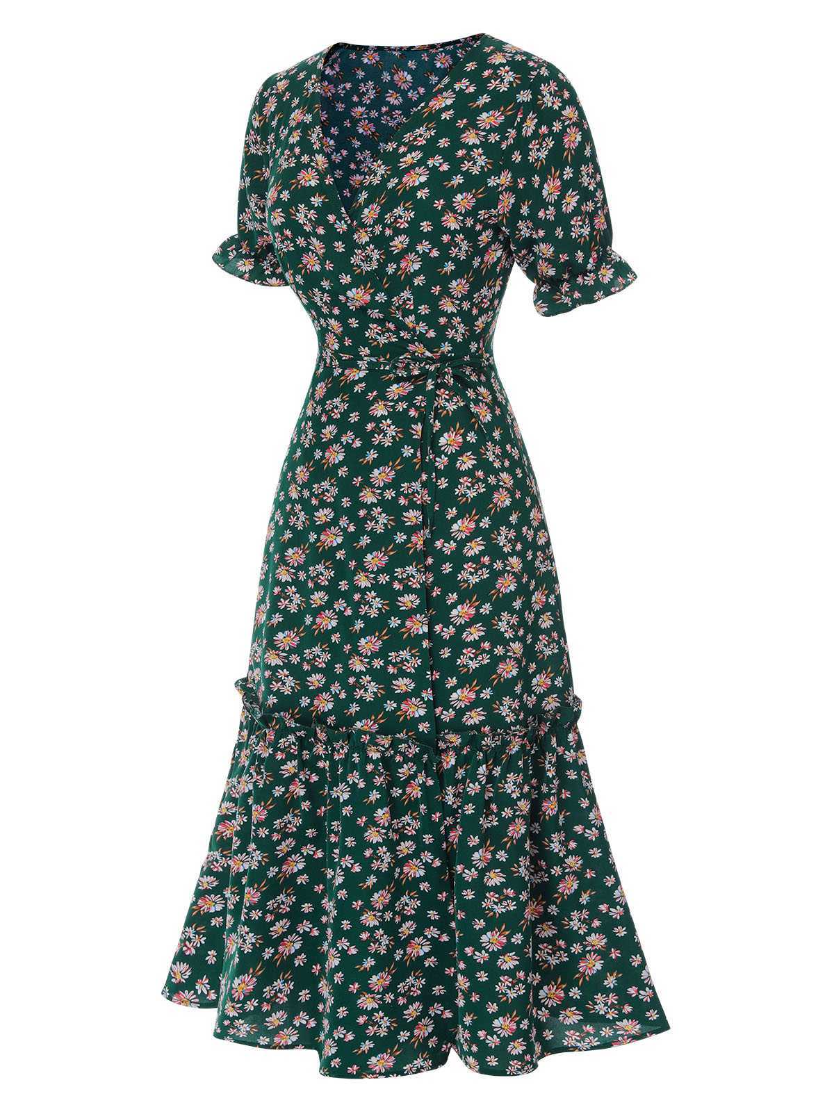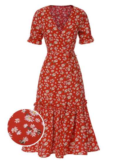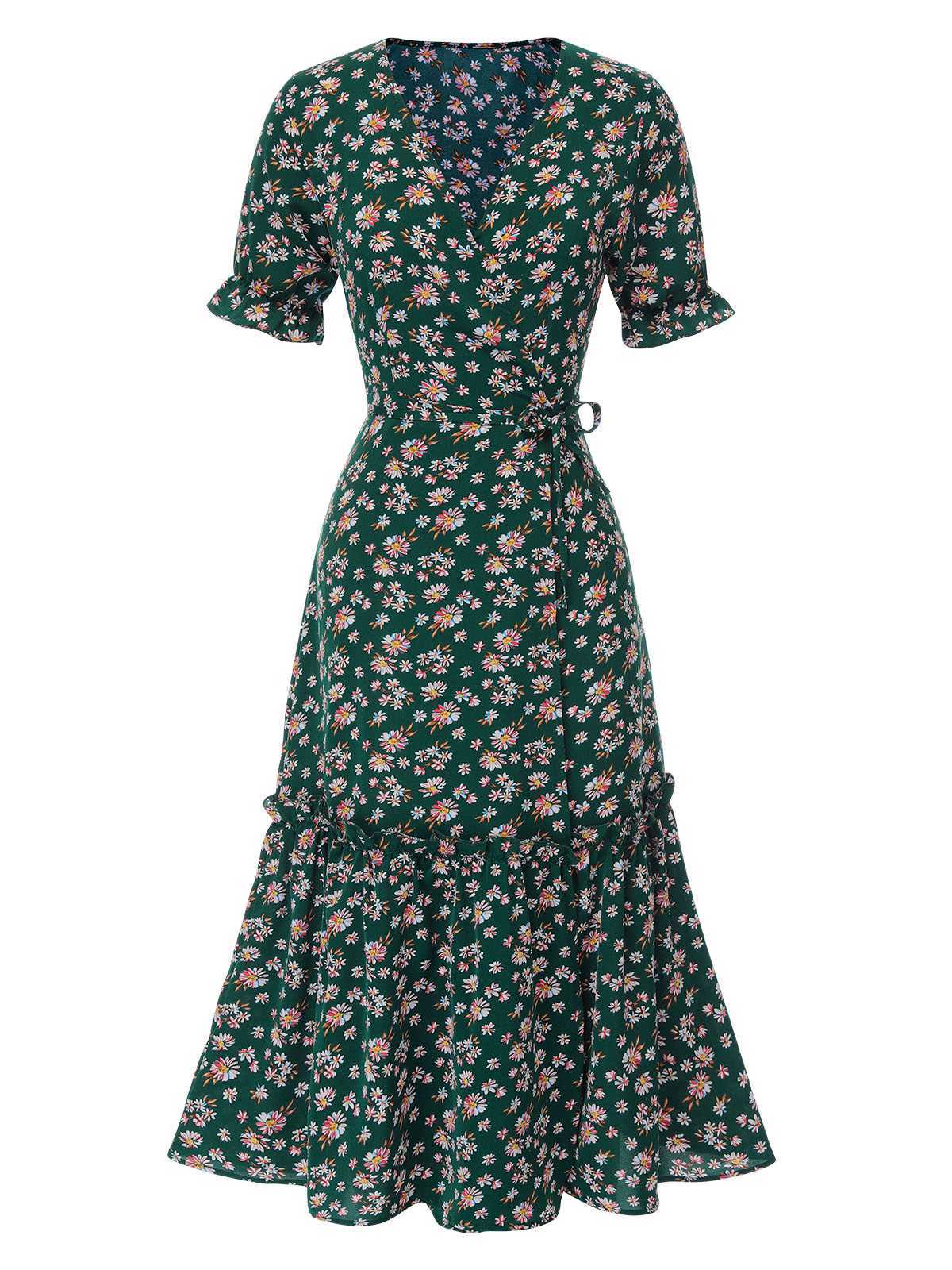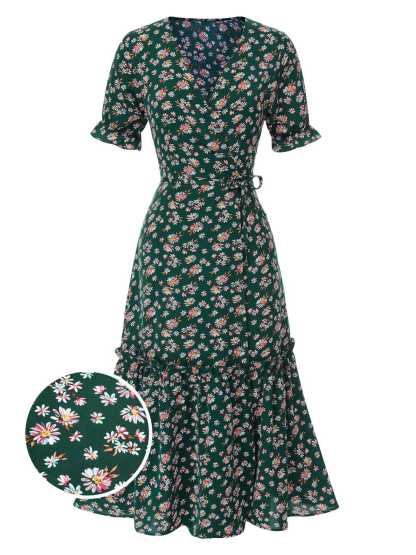 1930s Daisy Surplice V-Neck Belted Dress