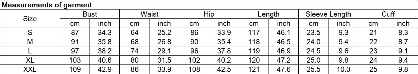 Note: The Measurements of the garment charts may vary due to different products or suppliers.
