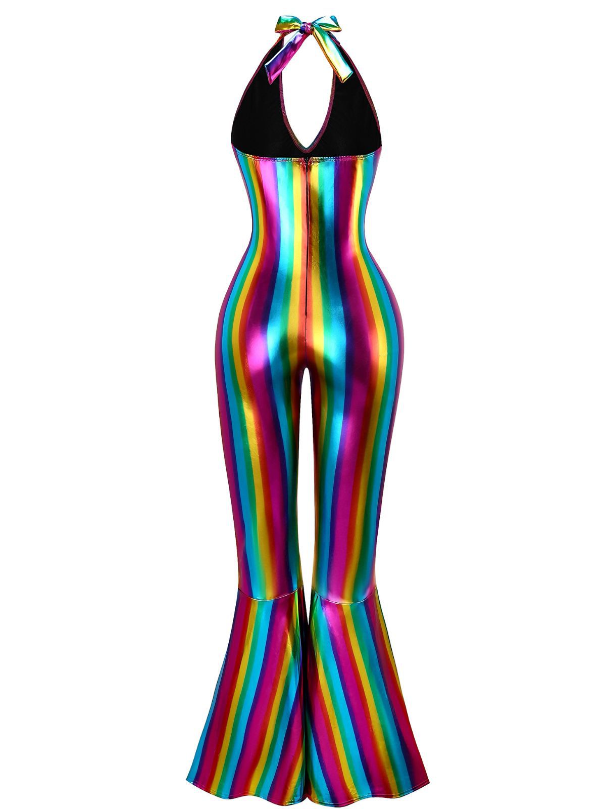 Disco nights go full rainbow in this Retro Stage 1970s jumpsuit, perfect for vintage lovers who crave bold, dance-floor drama. Shiny multicolour stripes hug your curves in a halter neckline and fitted bodice before kicking out into statement bell-bottom legs that swish with every move. Slip into this 1970s rainbow jumpsuit with platform heels and you’ll look like the brightest star under the mirrorball.