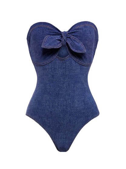 2PCS 1980s Strapless Denim Bow Swimsuit & Striped Cover-Up