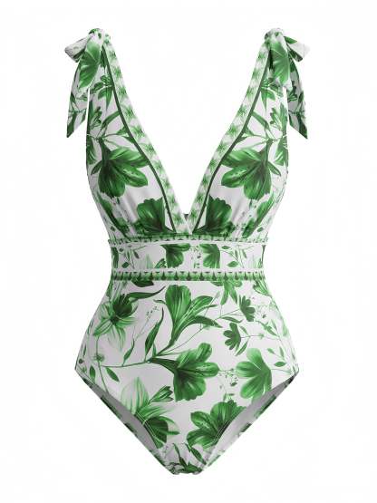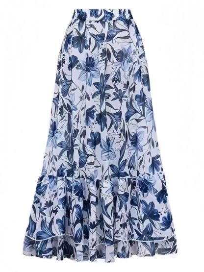 2PCS Blue 1940s Floral Tie-Shoulder Swimsuit Cover-Up
