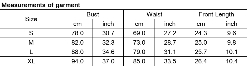 Note: The Measurements of the garment charts may vary due to different products or suppliers.