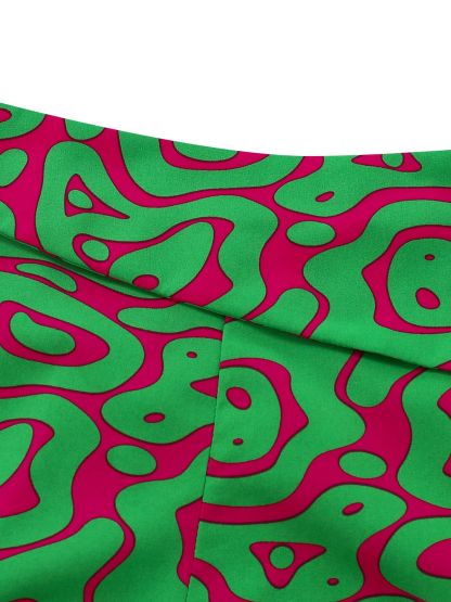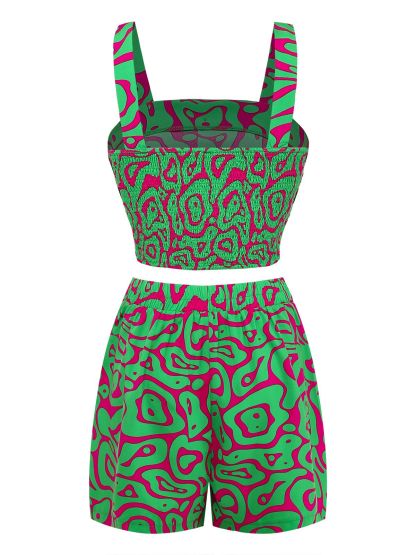 2PCS Green 1970s Button Abstract Print Cropped Top & Shorts