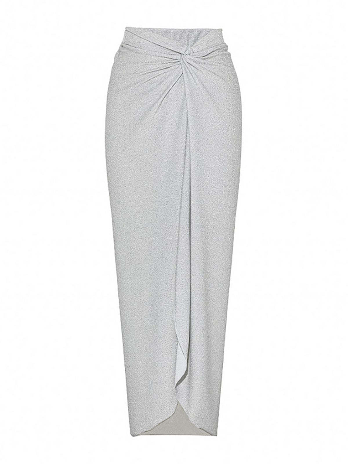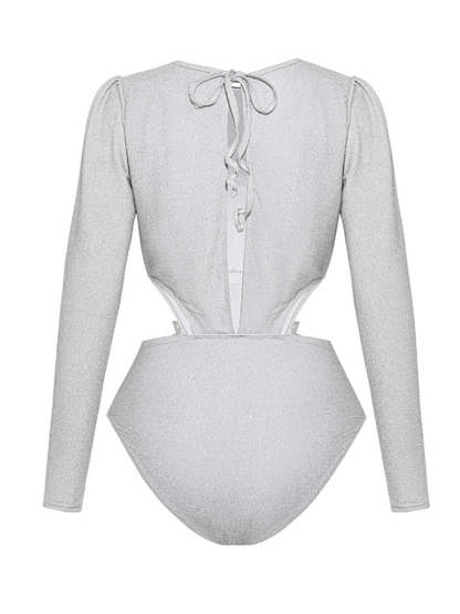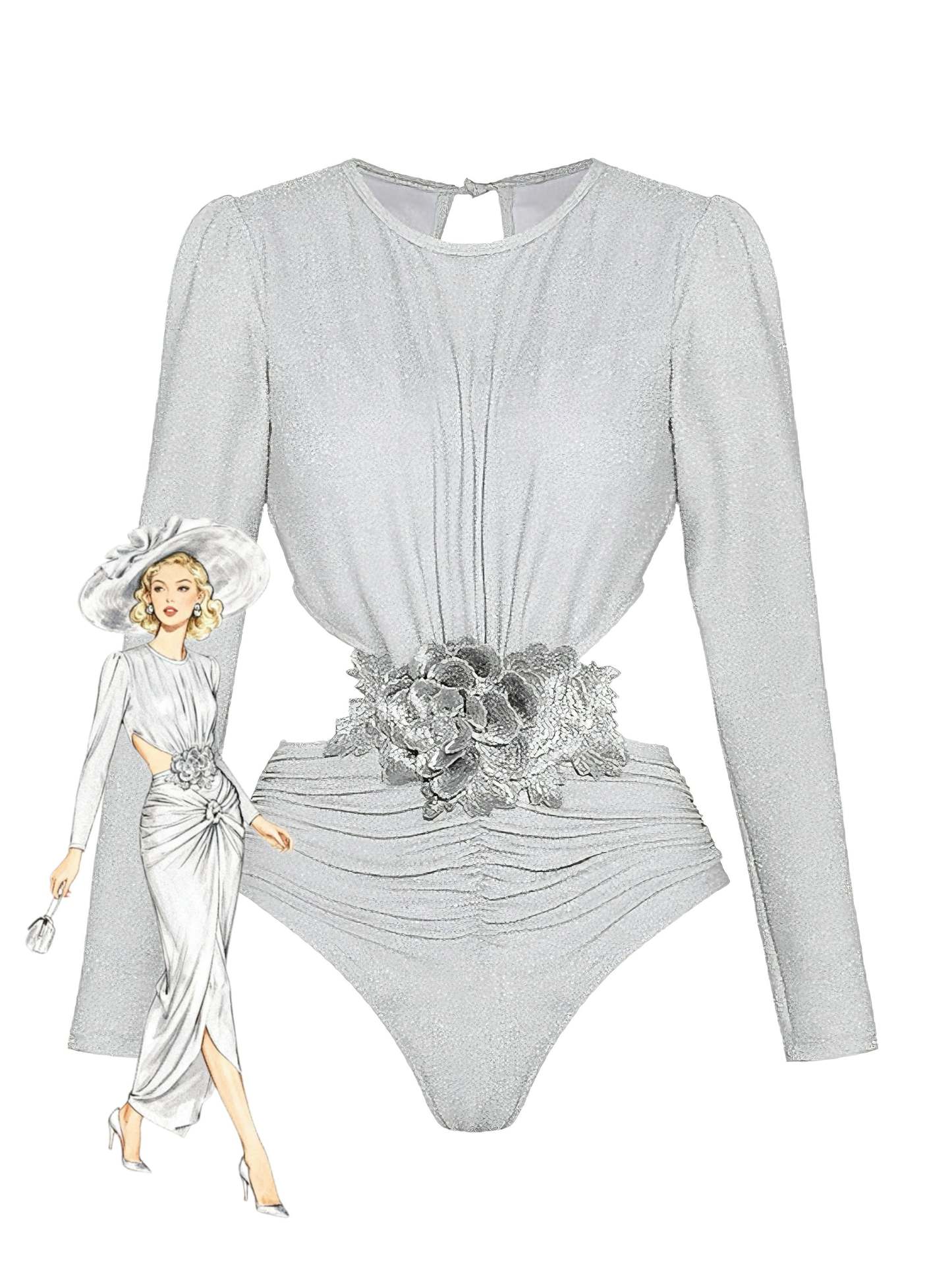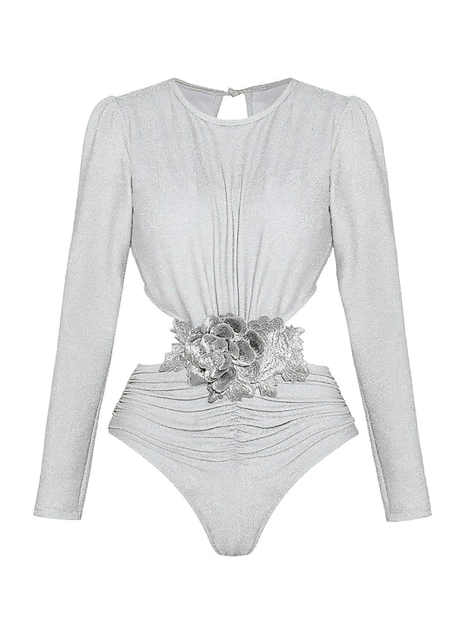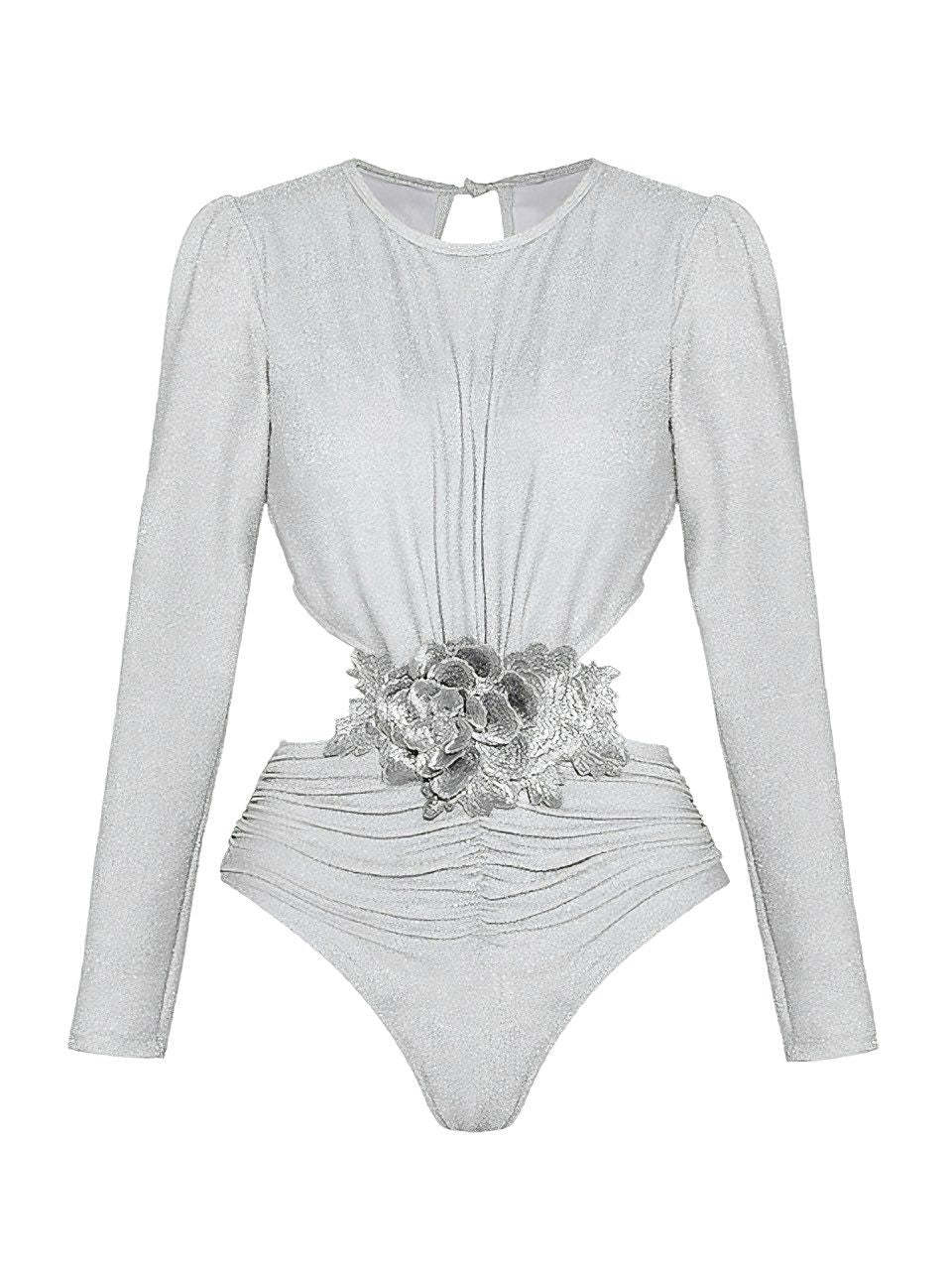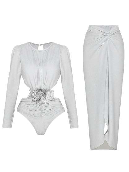 2PCS Silver 1970s 3D Floral Cutout One-Piece Swimsuit & Cover-Up