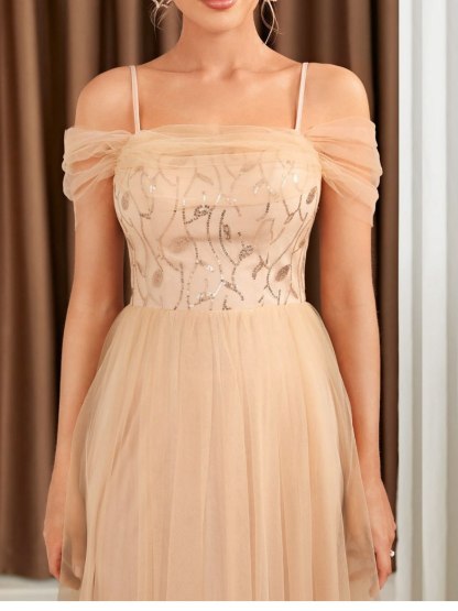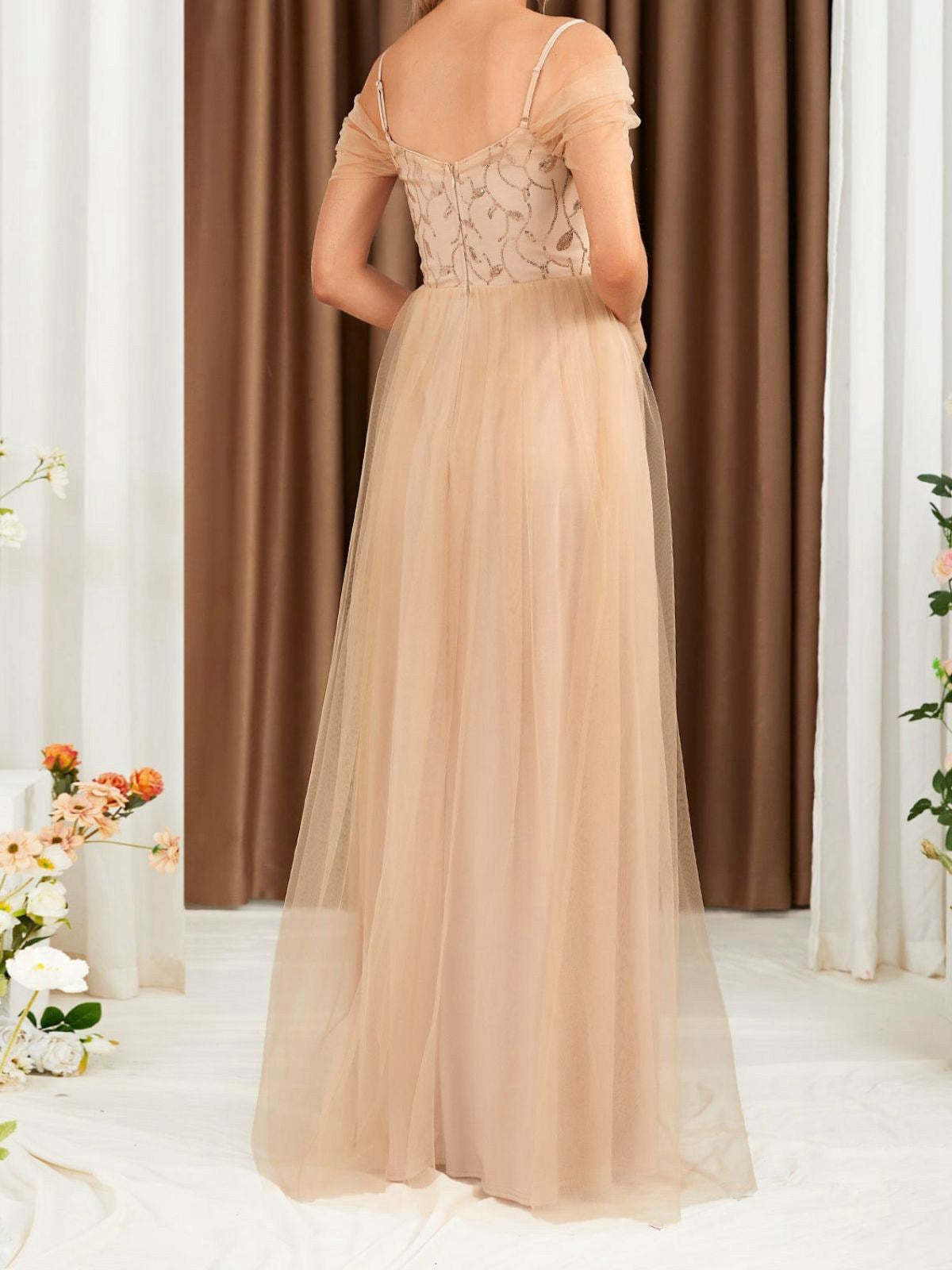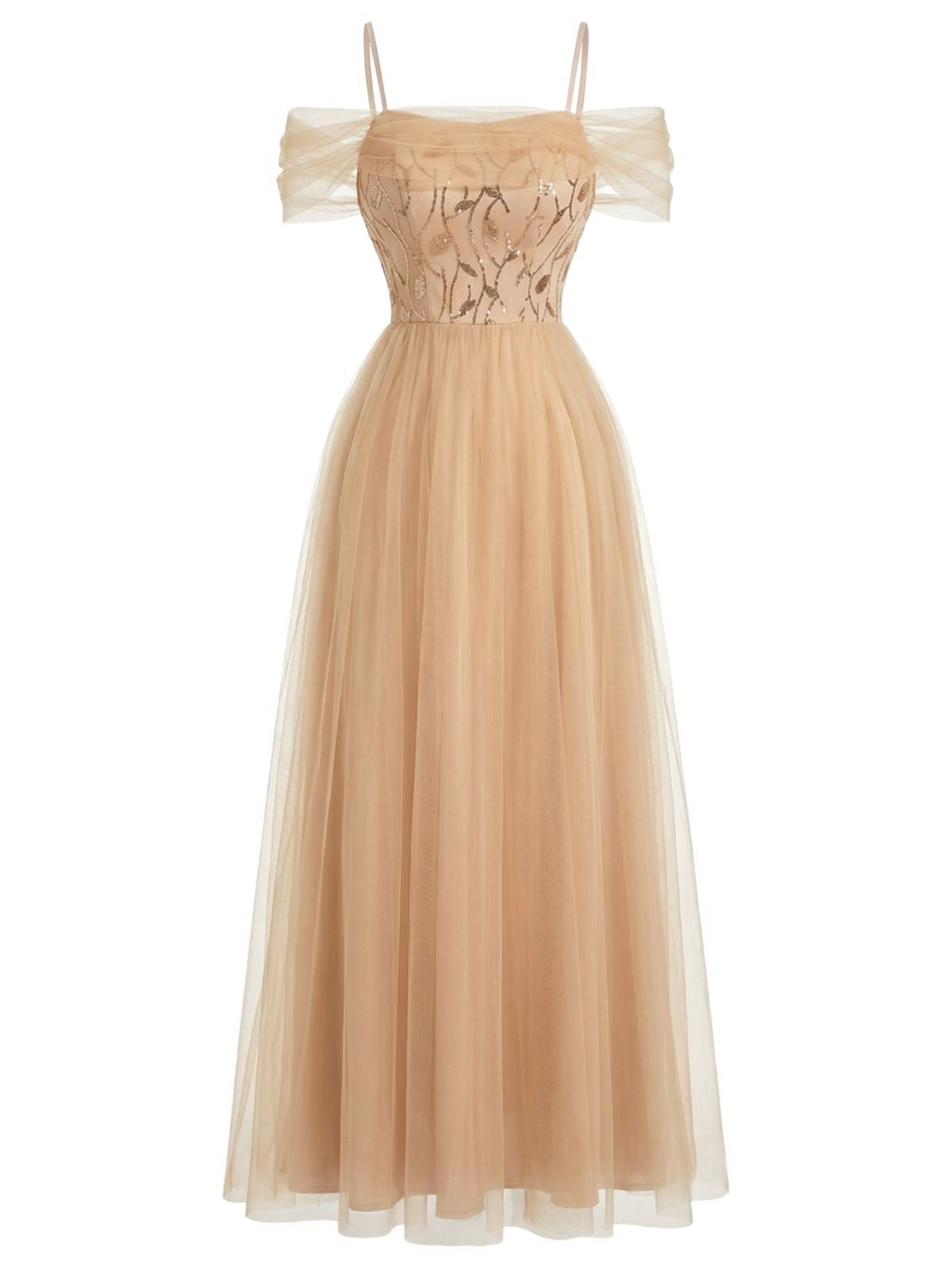 Beige 1930s Sequin Mesh Patchwork Cold-Shoulder Dress