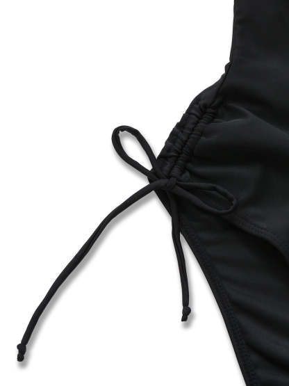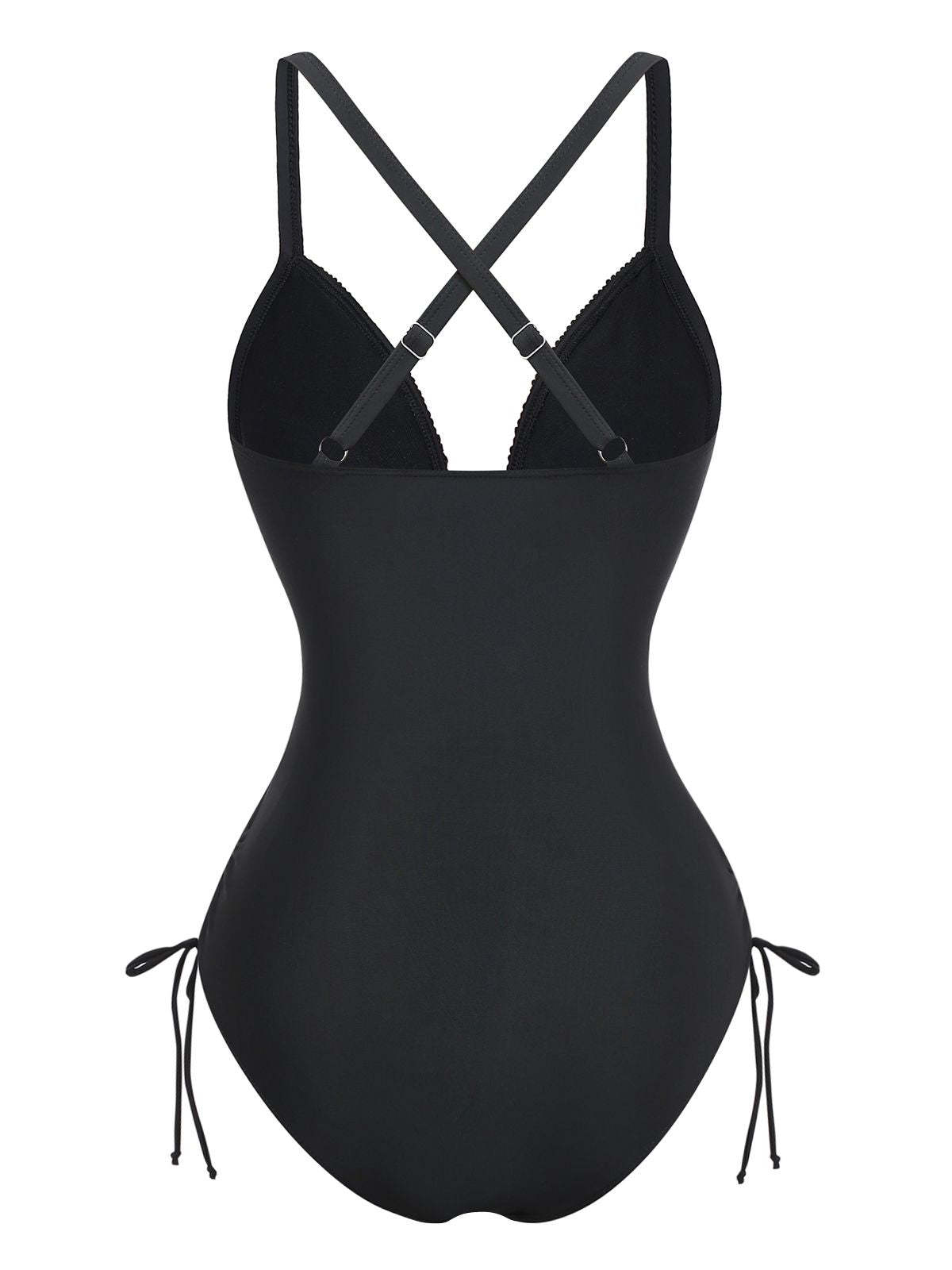 Black 1970s Deep V-Neck Tassels One-Piece Swimsuit