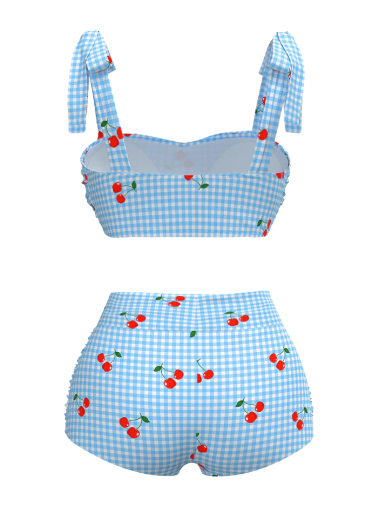 [Pre-Sale] Blue 1950s Cherry Plaid Lace-up Swimsuit