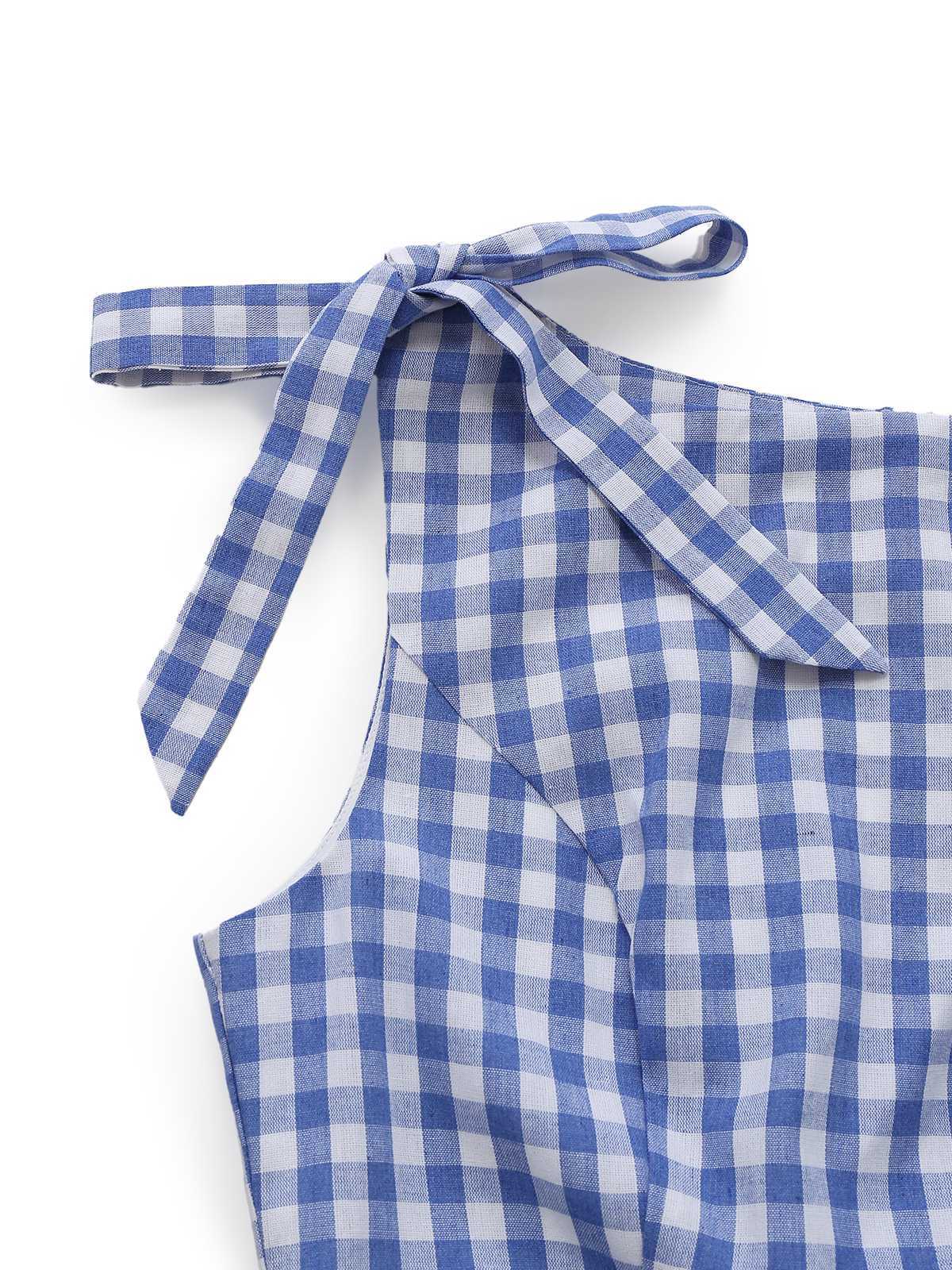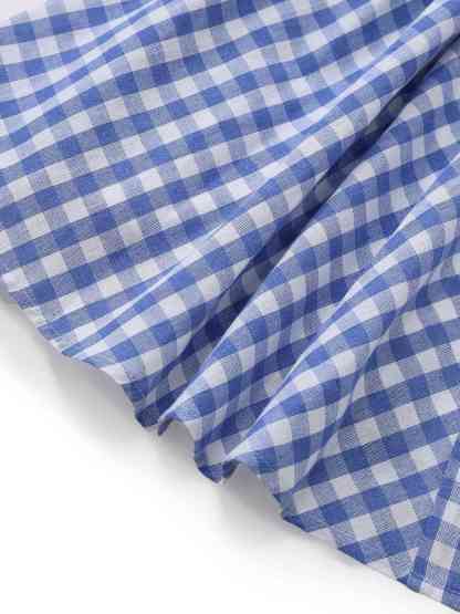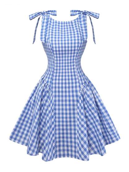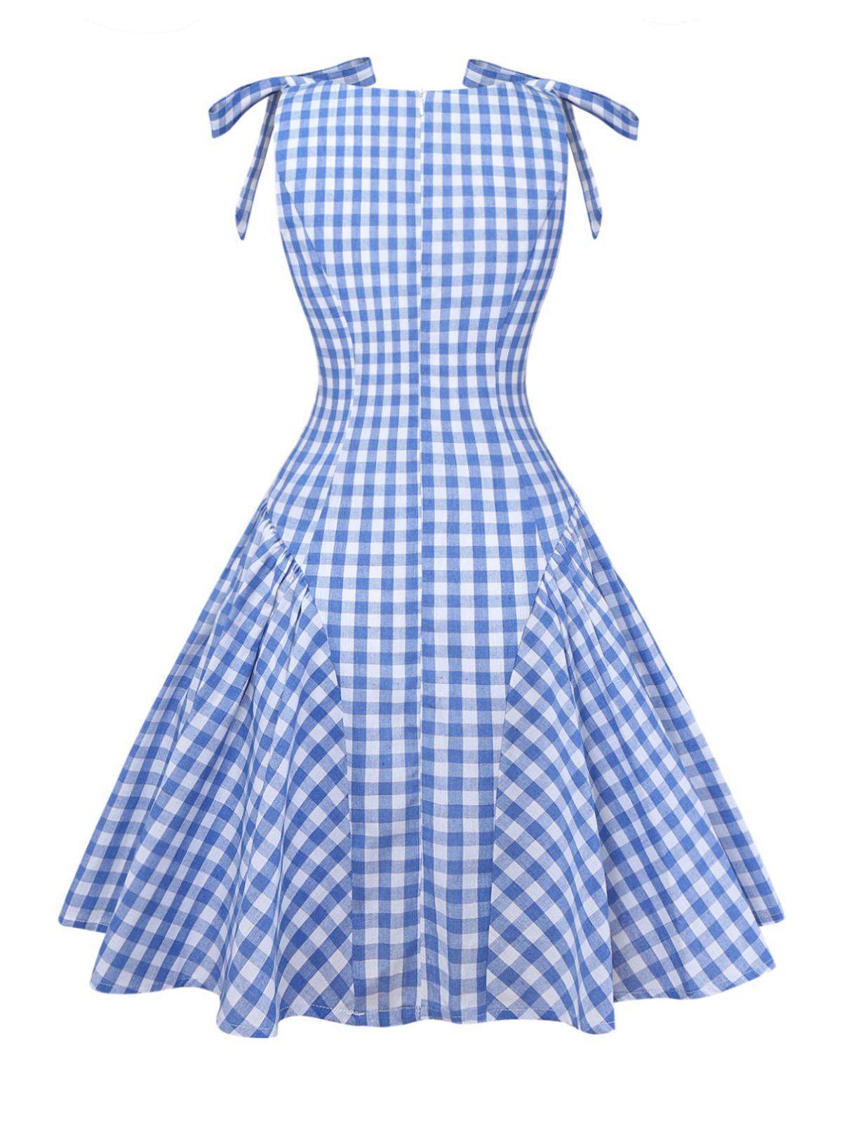 Blue 1960s Gingham Plaid Shoulder-Tie Empire Dress