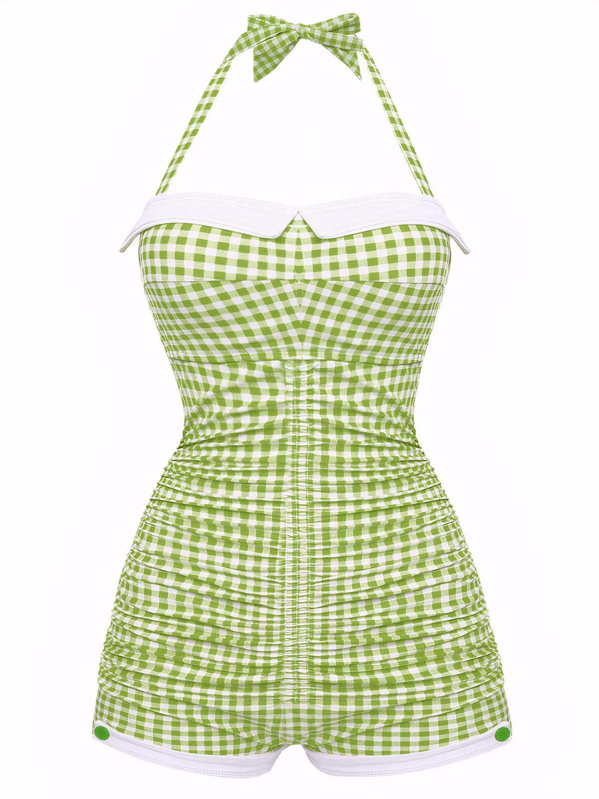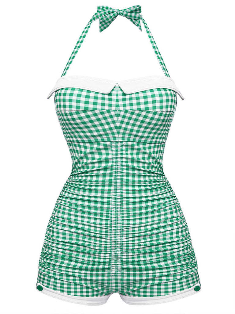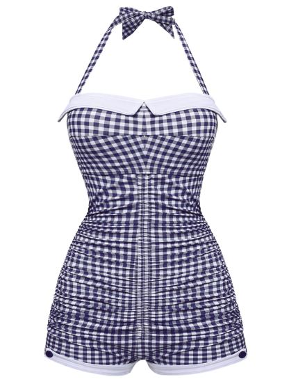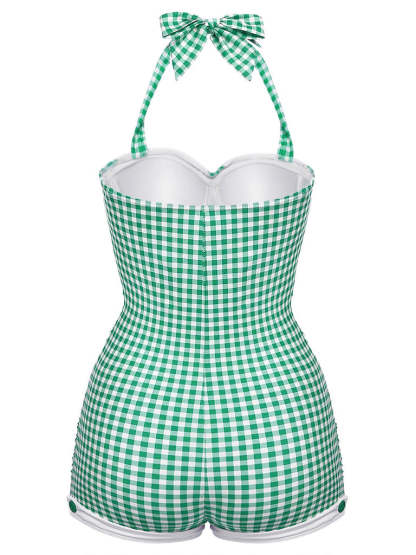 [US Warehouse] Gingham 1950s Halter Bowknot One-piece Swimsuit