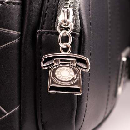 Features black enamelled telephone zipper charm