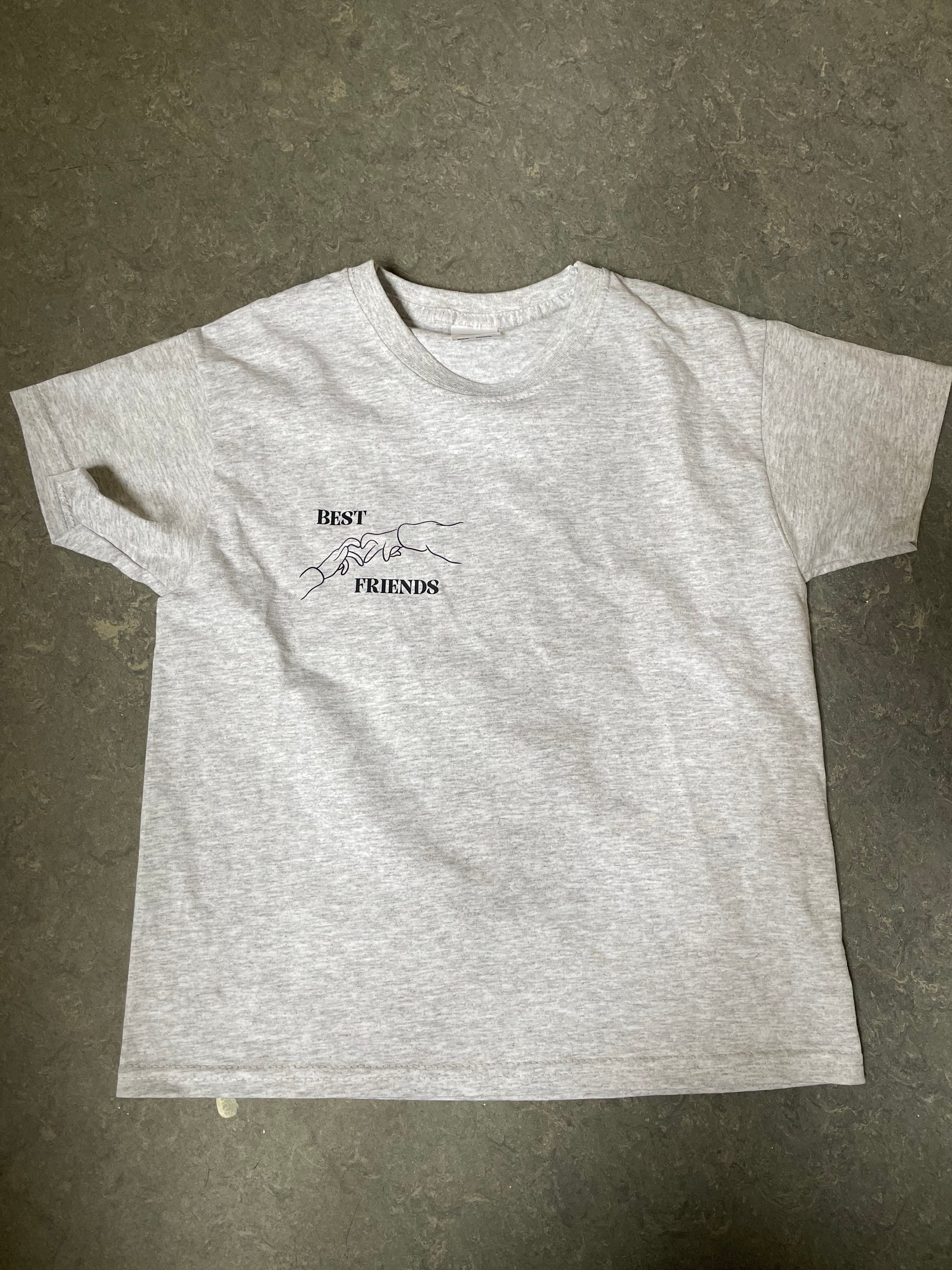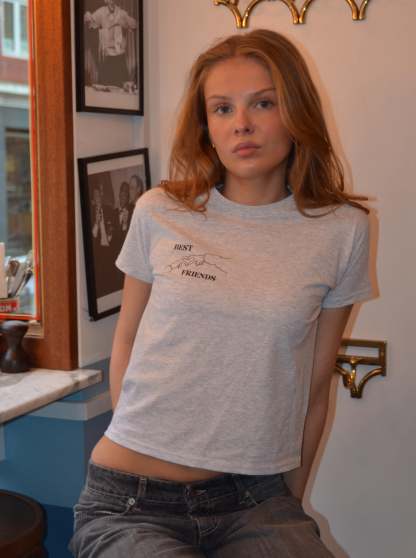 Baby tee with the text "best friends" which is perfect for matching with your best friend. Our tees are from fruit of the loom in a super soft and comfortable quality.