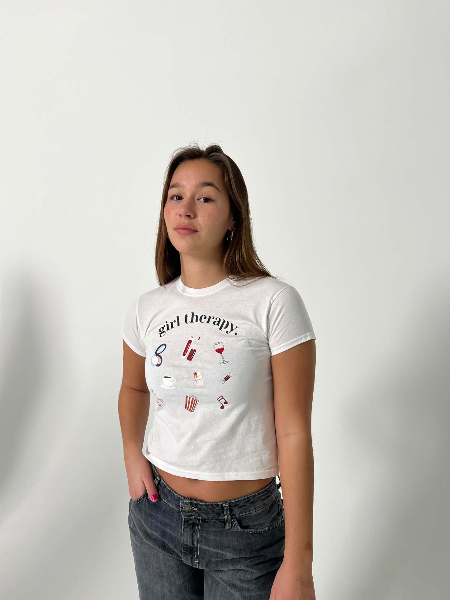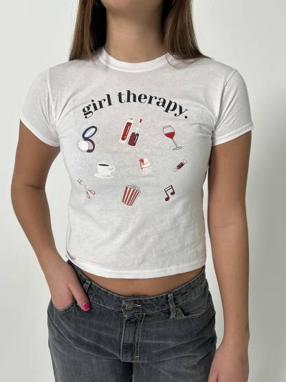 Baby tee with "Girl therapy" and lots of cute symbols. Our tees are from fruit of the loom and in a super soft and comfortable quality.