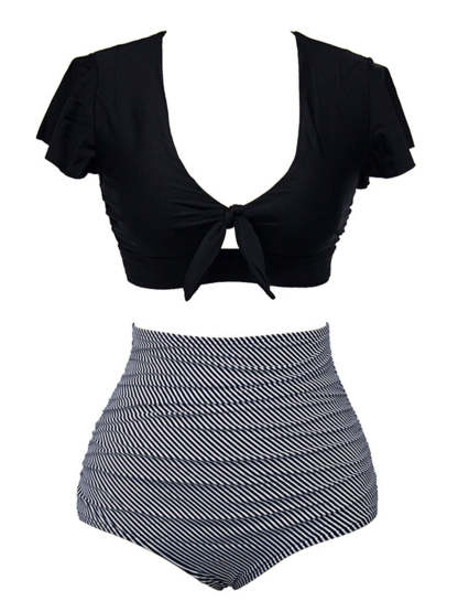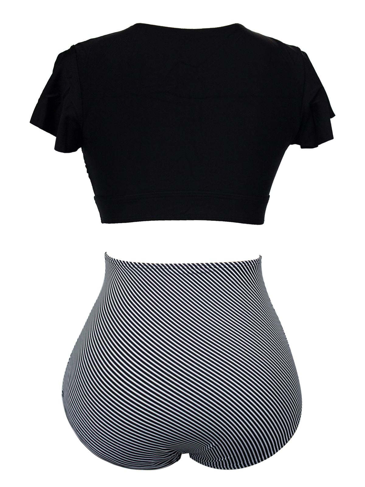 [Plus Size] 1950s Ruffle Sleeve Lace-Up Patchwork Swimsuit