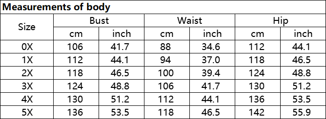 Size: There are 6 sizes (0X/1X/2X/3X/4X/5X) available. Please allow 1-2cm differences due to manual measurement. Thanks for understanding! (All measurements in cm and please note 1cm=0.39inch)
