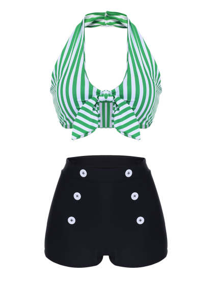 [Plus Size] Green 1950s Retro Halter Stripes Bikini Set