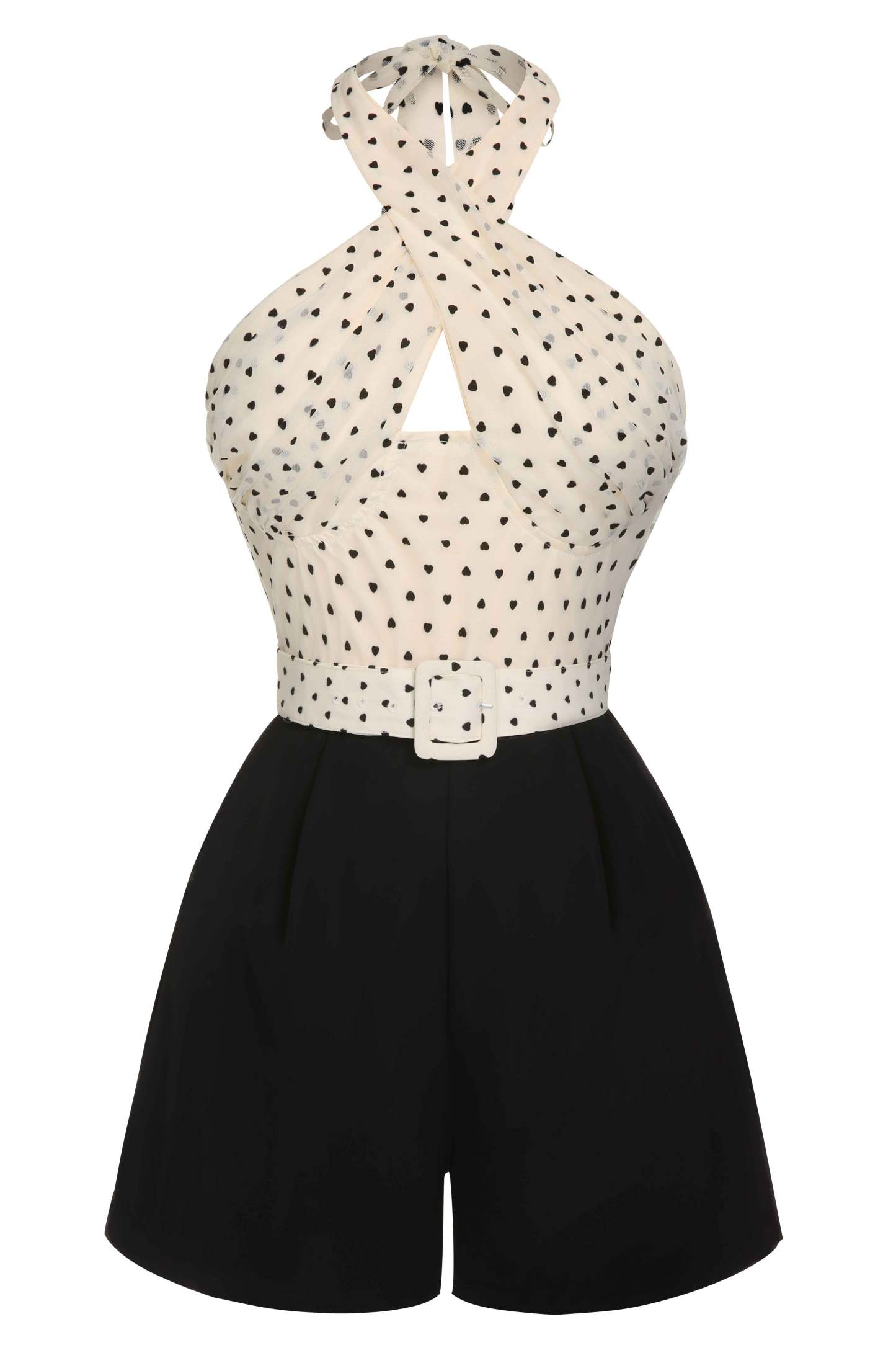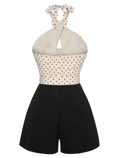 Step into a world of vintage charm with our Beige 1950s 3D Heart Halter Patchwork Romper from Retro Stage. This captivating piece effortlessly blends playful romance with timeless elegance. The top features a whimsical 3D heart pattern on soft beige fabric, with a halter neckline that crosses at the front, forming a flirtatious keyhole cutout. Cinched at the waist with a matching belt, the high-waisted black shorts offer a sophisticated contrast, ensuring you stand out with a bold yet chic style. Perfect for any summer occasion, this romper combines comfort and retro flair effortlessly.