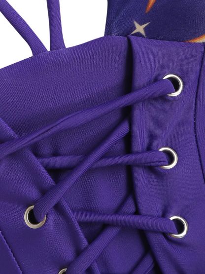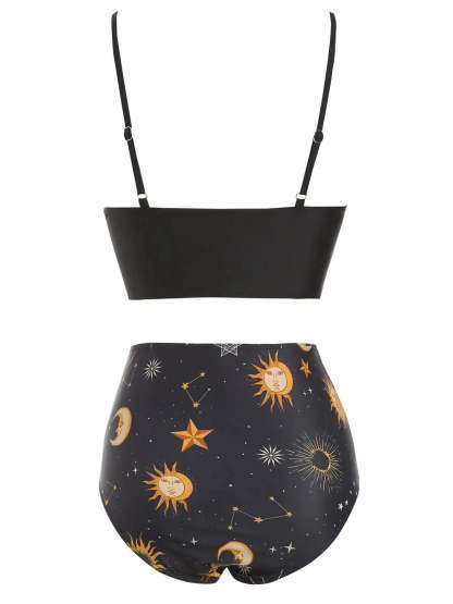 [US Warehouse] Black 1940s Sun Moon Stars Lace-Up Swimsuit