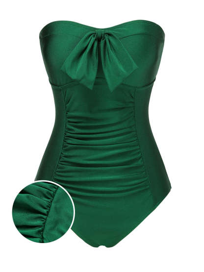 [US Warehouse] Dark Green 1970s Solid Pleated Bandeau Swimsuit