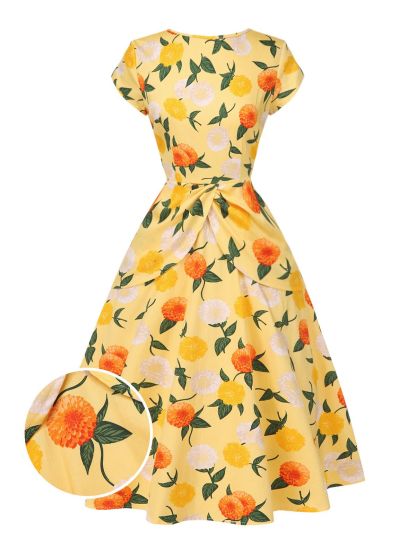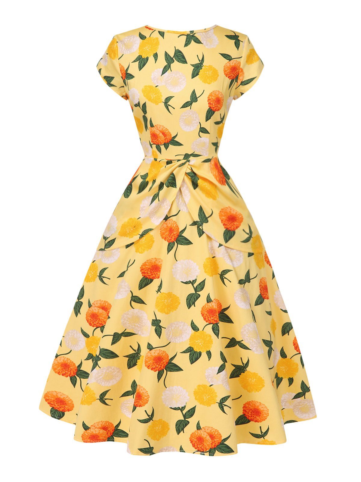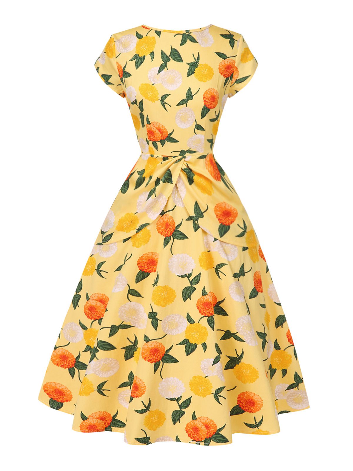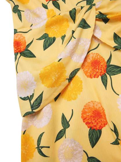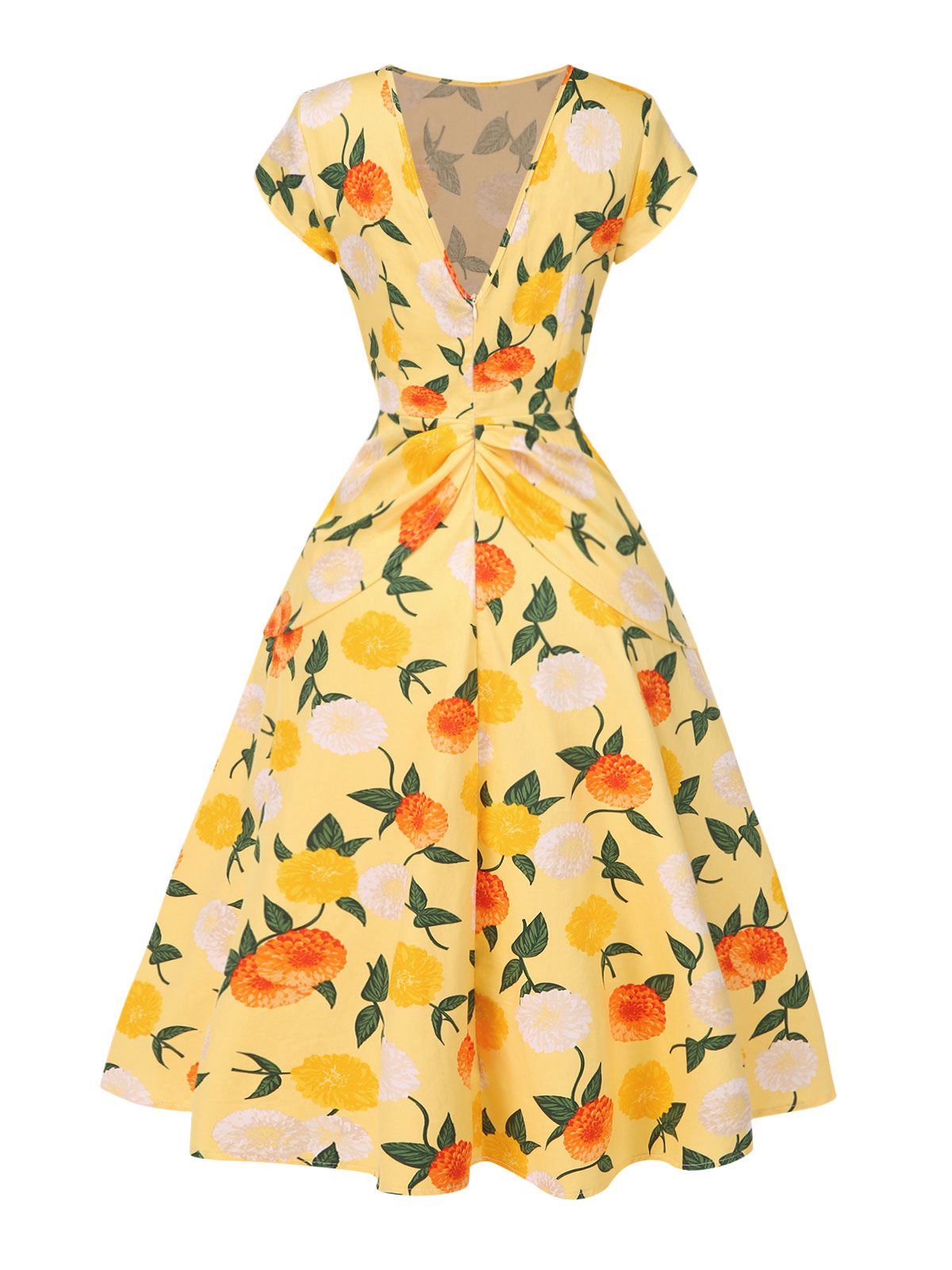 Yellow 1950s Hydrangea Floral Ruched Dress